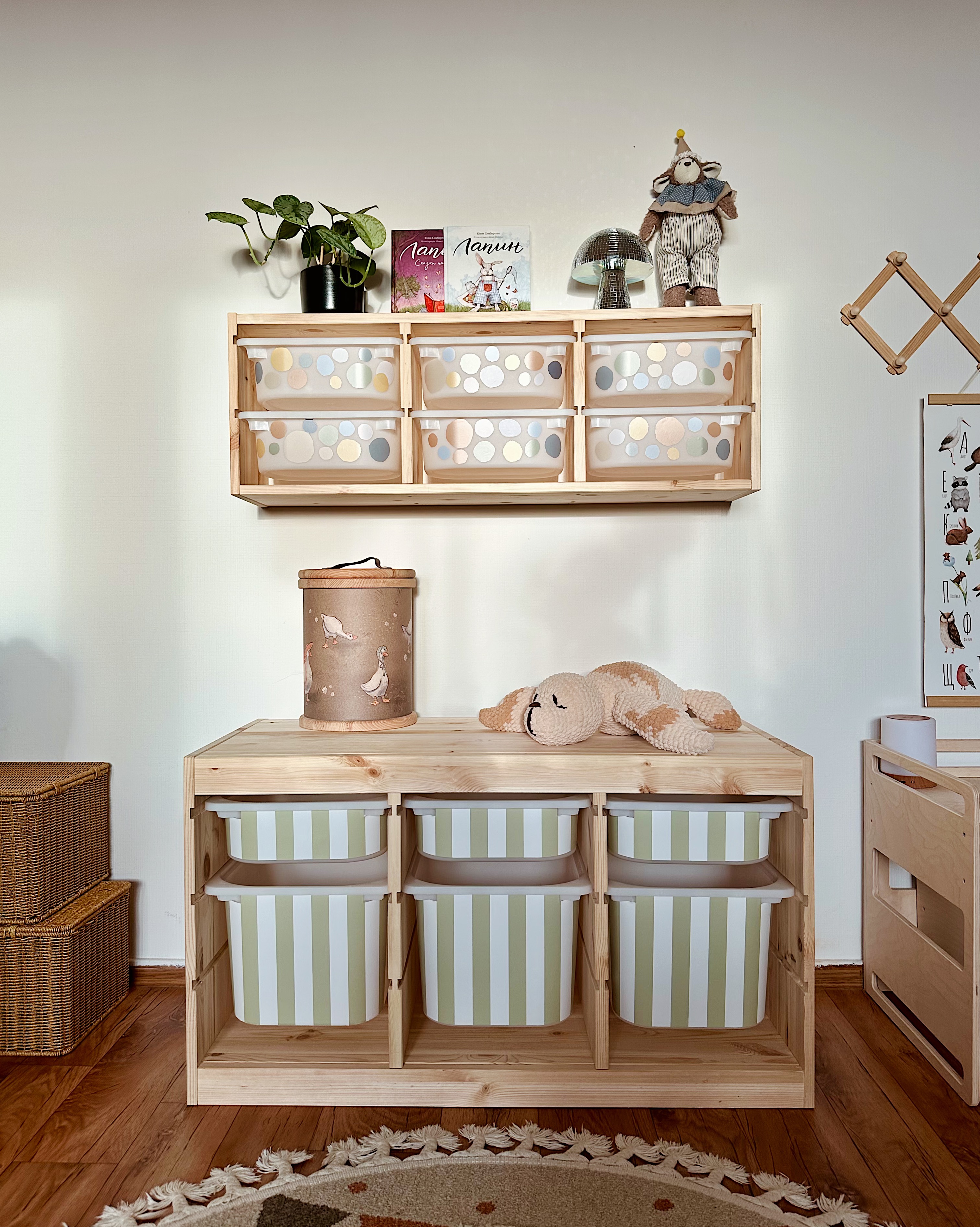 Преобразите детскую комнату за пару минут с помощью стильных наклеек для ящиков игрушек, как из Pinterest, созданных специально под размеры контейнеров Труфаст. Они помогают поддерживать порядок, делают систему хранения наглядной для ребёнка и становятся ярким акцентом в интерьере.
